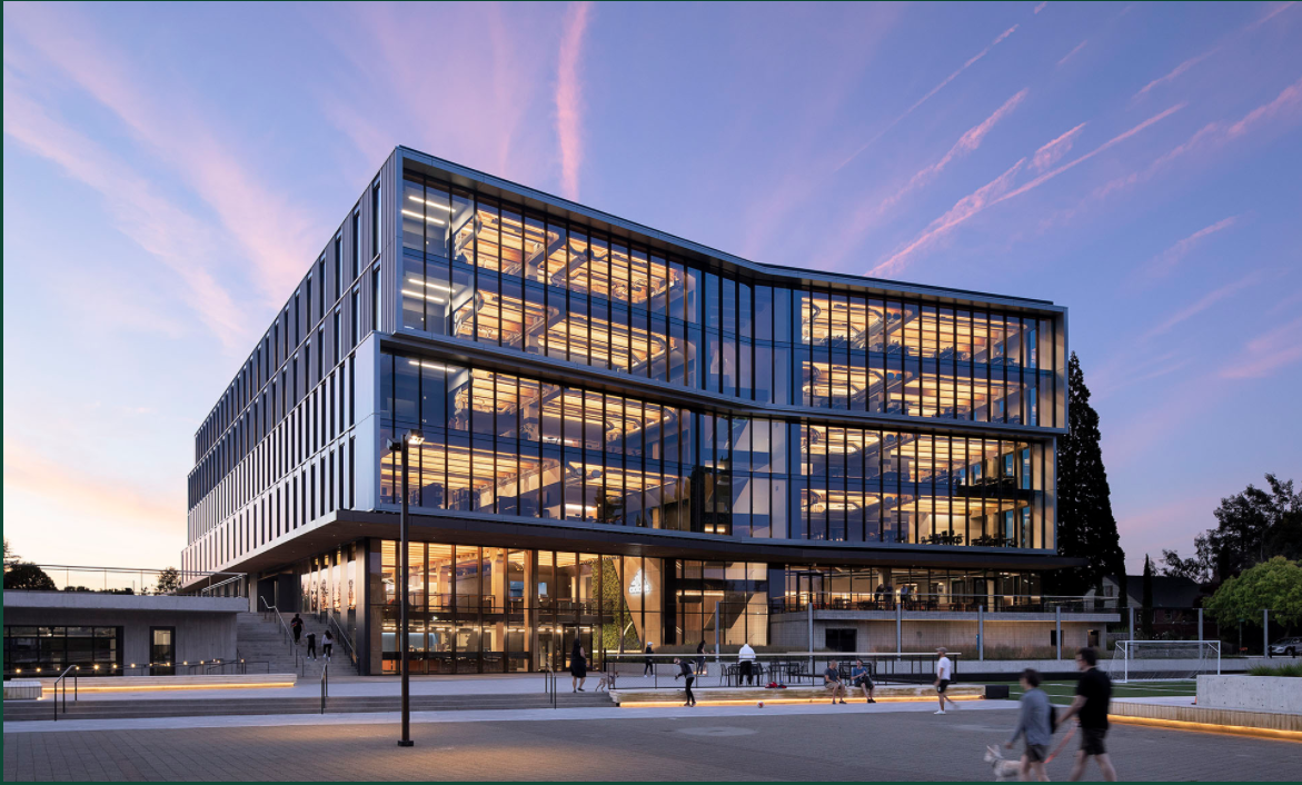 Captures the Striking Architecture of the Adidas North American Headquarters in Portland, Oregon, during a beautiful sunset